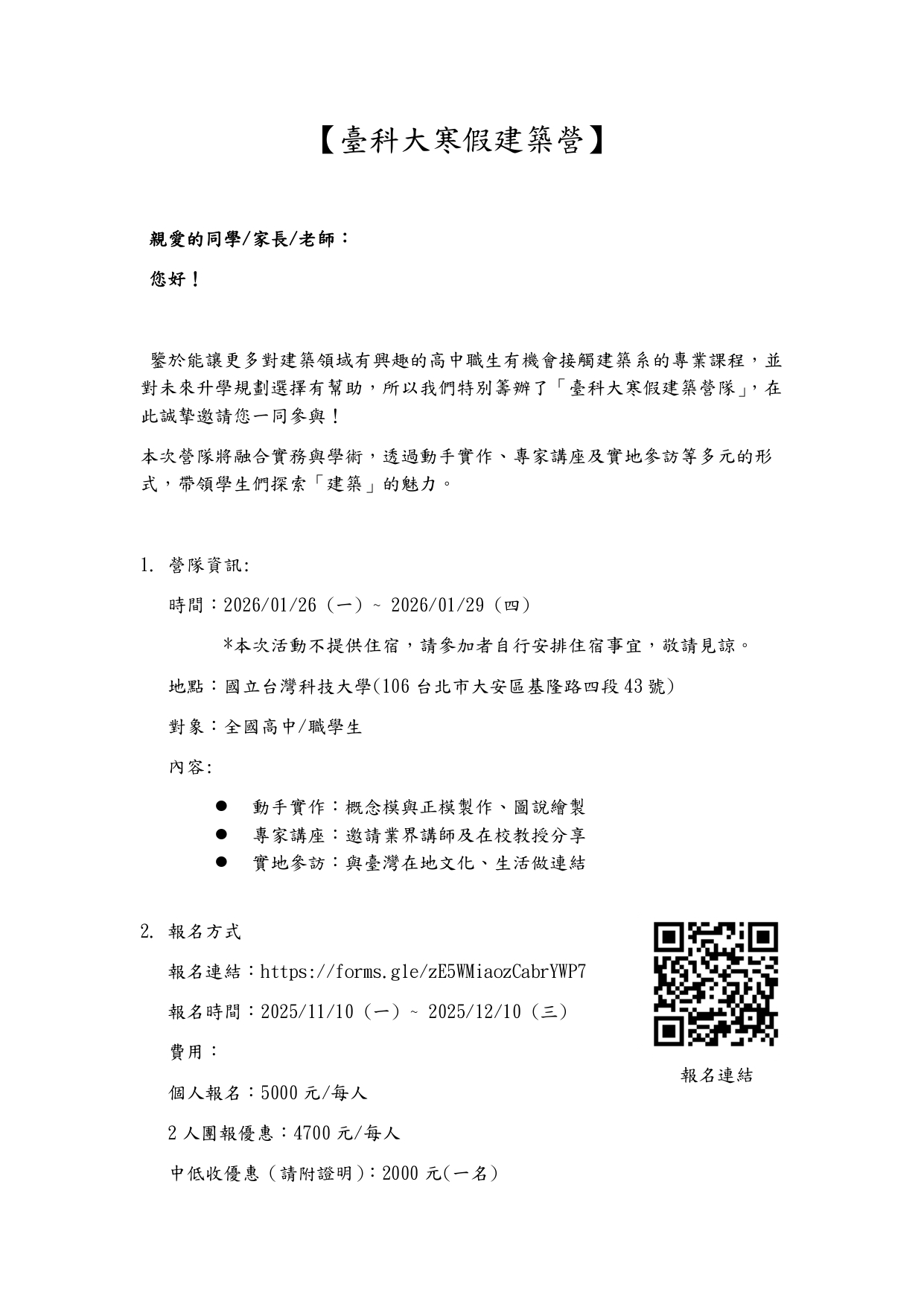 【輔導室】2025寒假營隊-臺科大建築營0126-0129